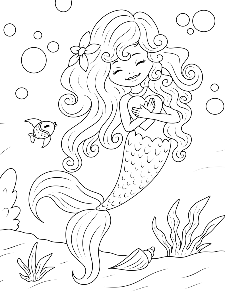 A happy mermaid posing on a throne or just a beautiful background. There are many options to draw and color this picture in.